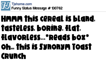 X hmmm this cereal is bland, tasteless, boring, flat, flavorless...*reads box* oh,,, this is Synonym Toast Crunch