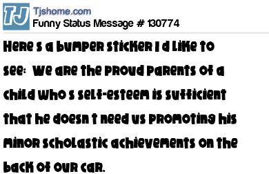 - # 7182 Here's a bumper sticker I'd like to see: “We are the proud parents of a child who's self-esteem is sufficient that he doesn't need us promoting his minor scholastic achievements on the back of our car.”