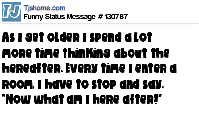 X As I get older I spend a lot more time thinking about the hereafter. Every time I enter a room, I have to stop and say, "Now what am I here after?"