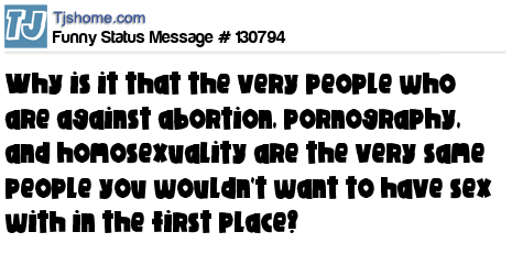 X Why is it that the very people who are against abortion, pornography, and homosexuality are the very same people you wouldn't want to have sex with in the first place?