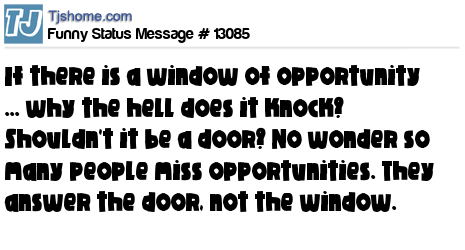 - # 22468 If there is a window of opportunity ... why the hell does it knock? Shouldn't it be a door? No wonder so many people miss opportunities. They answer the door, not the window.