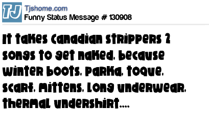 X says It takes Canadian strippers 2 songs to get naked, because winter boots, parka, toque, scarf, mittens, long underwear, thermal undershirt....