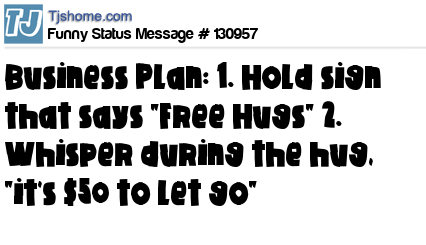 - # 188331 Business plan : 1. hold sign that says "free hugs" 2. Whisper during the hug, "it's $50 to let go"