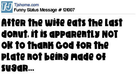 X says After the wife eats the last donut, it is apparently NOT OK to thank God for the plate not being made of sugar...