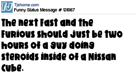 X is The next Fast and the Furious should just be two hours of a guy doing steroids inside of a Nissan Cube.
