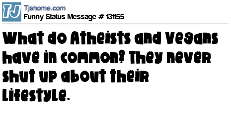 X What do Atheists and Vegans have in common? They never shut up about their lifestyle.
