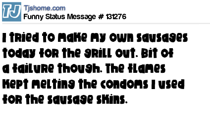 X says I tried to make my own sausages today for the grill out. Bit of a failure though. The flames kept melting the condoms I used for the sausage skins.