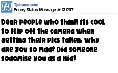 X says Dear people who think its cool to flip off the camera when getting their pics taken; Why are you so mad? Did someone sodomise you as a kid?