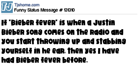 - # 27379 I have Bieber Fever. I listened to a song by Justin Bieber and now have a 103 degree temperature, I'm throwing up, and have a huge headache.