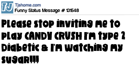 X  Please stop inviting me to play CANDY CRUSH I'm type 2 Diabetic & I'm watching my sugar!!!