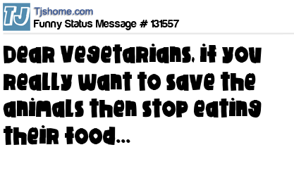 - # 80507 Dear Vegetarians, you're not doing us any favors, all your doing is eating our food supply. Sincerely, Starving Animals.
