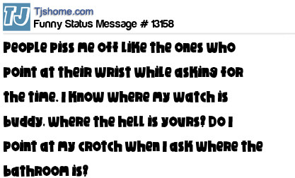 - # 76336 I hate the people who point at their wrist asking for the time... I know where my watch is pal, where the hell is yours? Do I point at my crotch when I ask where the toilet is?