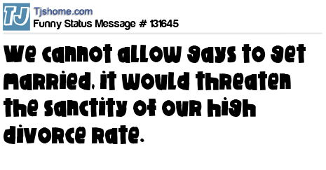 - # 131507 We cannot allow gays to marry! It would destroy the sanctity of our prestigious divorce rate.