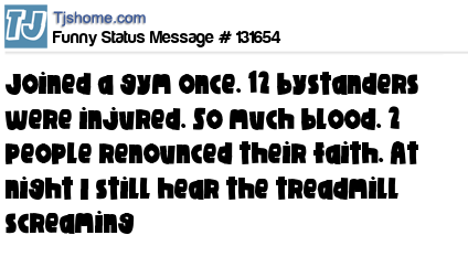 X Joined a gym once. 12 bystanders were injured. So much blood. 2 people renounced their faith. At night I still hear the treadmill screaming