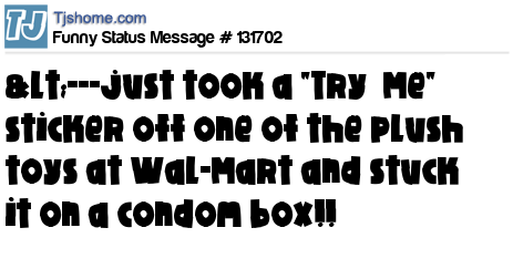 X <---just took a "Try Me" sticker off one of the plush toys at Wal-Mart and stuck it on a condom box!!