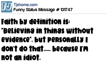 X says Faith by definition is: "Believing in things without evidence", but personally I don't do that..... because I'm not an idiot.