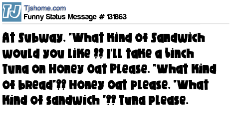 X says At Subway. "What kind of Sandwich would you like ?? I'll take a 6inch Tuna on Honey Oat Please. "What kind of bread"?? Honey Oat please. "What kind of sandwich "?? Tuna please.