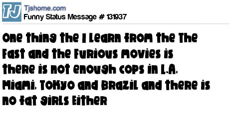 X says one thing the I learn from the The Fast and the Furious movies is there is not enough cops in L.A, Miami, Tokyo and Brazil and there is no fat girls Either