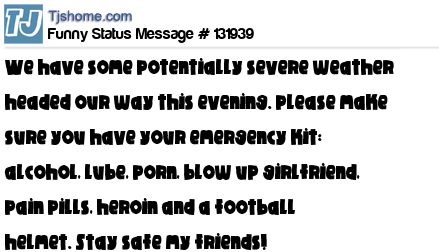 X says we have some potentially severe weather headed our way this evening. please make sure you have your emergency kit: alcohol, lube, porn, blow up girlfriend, pain pills, heroin and a football helmet. Stay safe my friends!