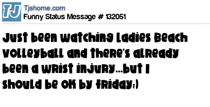 X says Just been watching Ladies Beach volleyball and there's already been a wrist injury...but I should be ok by friday;)