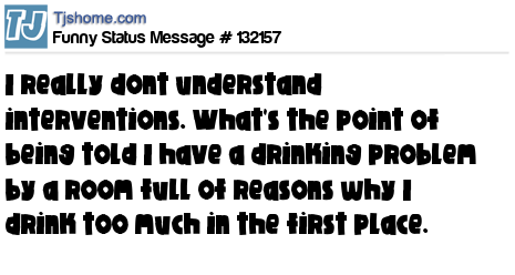 - # 74291 I don't understand interventions. What's the point of being told I drink too much by a room full of the reasons I drink in the first place?