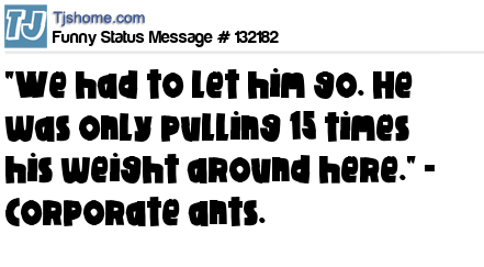 X says "We had to let him go. He was only pulling 15 times his weight around here." - Corporate ants.