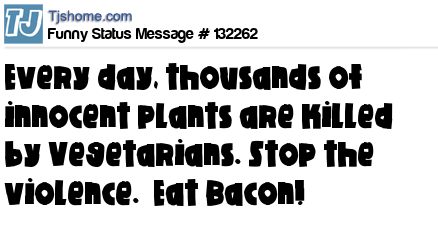 X says Every day, thousands of innocent plants are killed by Vegetarians. Stop the violence. Eat Bacon!