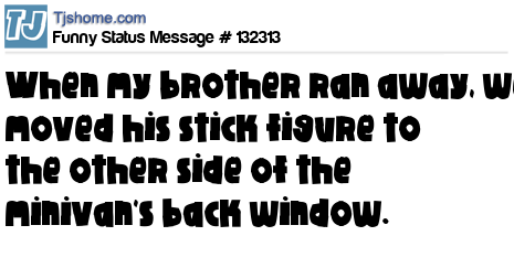- # 91136 Sometimes when I am bored I like to park on the side of the freeway and stick a blow dryer out the window and watch the cars slam on their brakes.