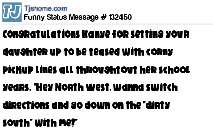 X Congratulations Kanye for setting your daughter up to be teased with corny pickup lines all throughtout her school years. "Hey North West, wanna switch directions and go down on the "dirty south" with me?"