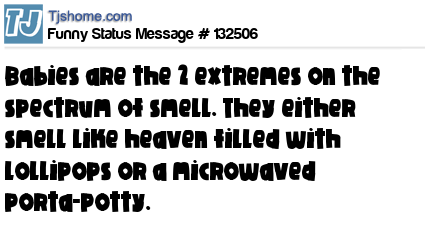 - # 103524 Babies are the two extremes on the spectrum of smell. They either smell like heaven filled with lollipops or a microwaved porta-potty.