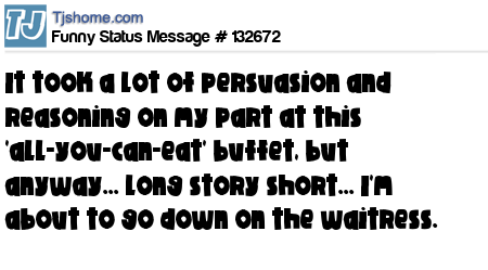 - # 132687 It took a lot of persuasion and reasoning on my part at this 'all-you-can-eat' buffet, but anyway... long story short... I'm about to blow the busboy.