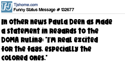 X says In other news Paula Deen as made a statement in regards to the DOMA ruling: "I'm real excited for the fags, especially the colored ones."