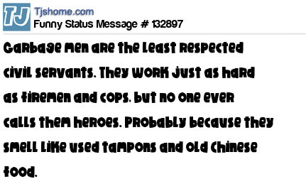 X says Garbage men are the least respected civil servants. They work just as hard as firemen and cops, but no one ever calls them heroes. Probably because they smell like used tampons and old Chinese food.