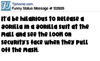 X says It'd be hilarious to release a gorilla in a gorilla suit at the mall and see the look on security's face when they pull off the mask.