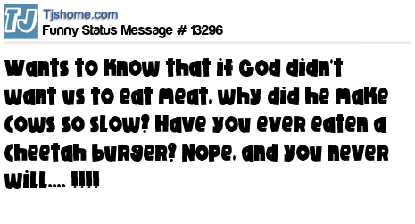 - # 12959 wants to know that if god didn't want us to eat meat, why did he make cows so slow? Have you ever eaten a cheetah burger? Nope, and you never will....