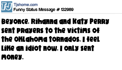 - # 130921 Beyonce, Rihanna and Katy Perry sent prayers to the victims of Oklahoma. I feel like an idiot now, I only sent money.