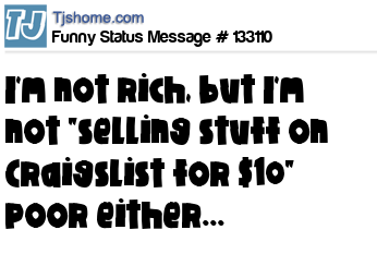 - # 133115 Dude you're doing it wrong!!! Its, I'm poor (not rich), but I'm not "selling stuff on Craigslist for $10" poor