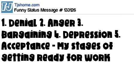 X says 1. Denial 2. Anger 3. Bargaining 4. Depression 5. Acceptance - My stages of getting ready for work