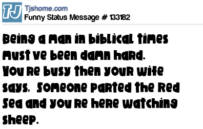 X says Being a man in biblical times must’ve been damn hard. You’re busy then your wife says, “Someone parted the Red Sea and you’re here watching sheep.”