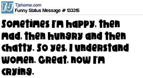 X says Sometimes I'm happy, then mad, then hungry and then chatty. So yes, I understand women. Great, now I'm crying.