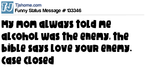 X My mom always told me alcohol was the enemy, the bible says Love your enemy. Case Closed