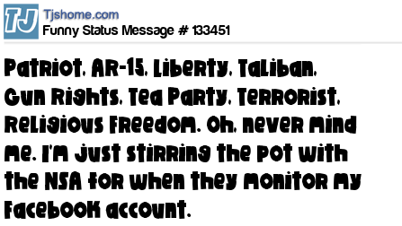 X says Patriot, AR-15, Liberty, Taliban, Gun Rights, Tea Party, Terrorist, Religious Freedom. Oh, never mind me. I'm just stirring the pot with the NSA for when they monitor my Facebook account.