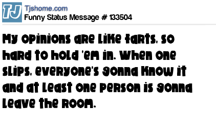 X My opinions are like farts, so hard to hold 'em in. When one slips, everyone's gonna know it and at least one person is gonna leave the room.