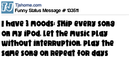 X I have 3 moods: Skip every song on my iPod, let the music play without interruption, play the same song on repeat for days
