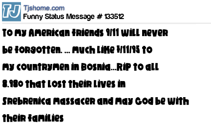 X says To my American friends 9/11 will never be forgotten. ... much like 7/11/95 to my countrymen in Bosnia...RiP to all 8.980 that lost their lives in Srebrenica massacer and may God be with their families