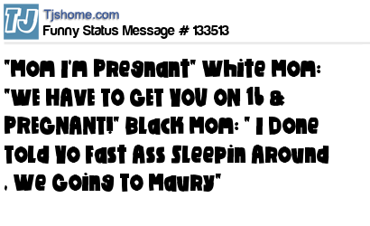 X says "Mom I'm Pregnant" White Mom: "WE HAVE TO GET YOU ON 16 & PREGNANT!" Black Mom: " I Done Told Yo Fast Ass Sleepin Around , We Going To Maury"