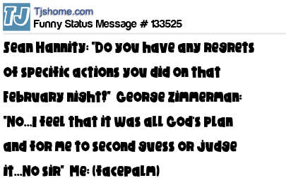X Sean Hannity: "Do you have any regrets of specific actions you did on that February night?" George Zimmerman: "No...I feel that it was all God's plan and for me to second guess or judge it...No sir" Me: (facepalm)