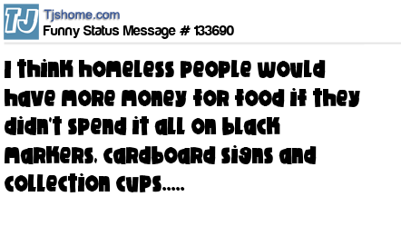 - # 144137 I'm not giving any more money to the homeless. They're just going to spend it on cardboard and Sharpie's!