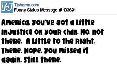 X says America, you've got a little injustice on your chin. No, not there. A little to the right. There. Nope, you missed it again. Still there.