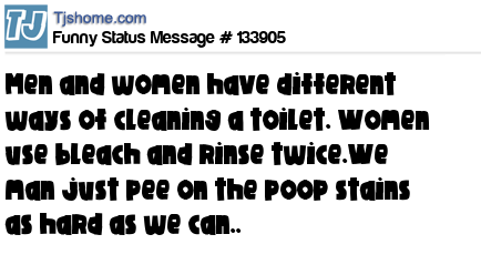 - # 58113 Guy's and girls have different ways of cleaning the toilet. girls uses a scrub brush while a guy pisses as hard as he can on the poop stains.